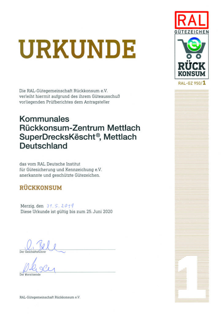 Das kommunale Rückkonsumzentrum der Gemeinde Mettlach ist mit dem RAL-Gütezeichen für innovativen und vorbildlichen Umgang mit Altprodukten von Bürgern ausgezeichnet worden.